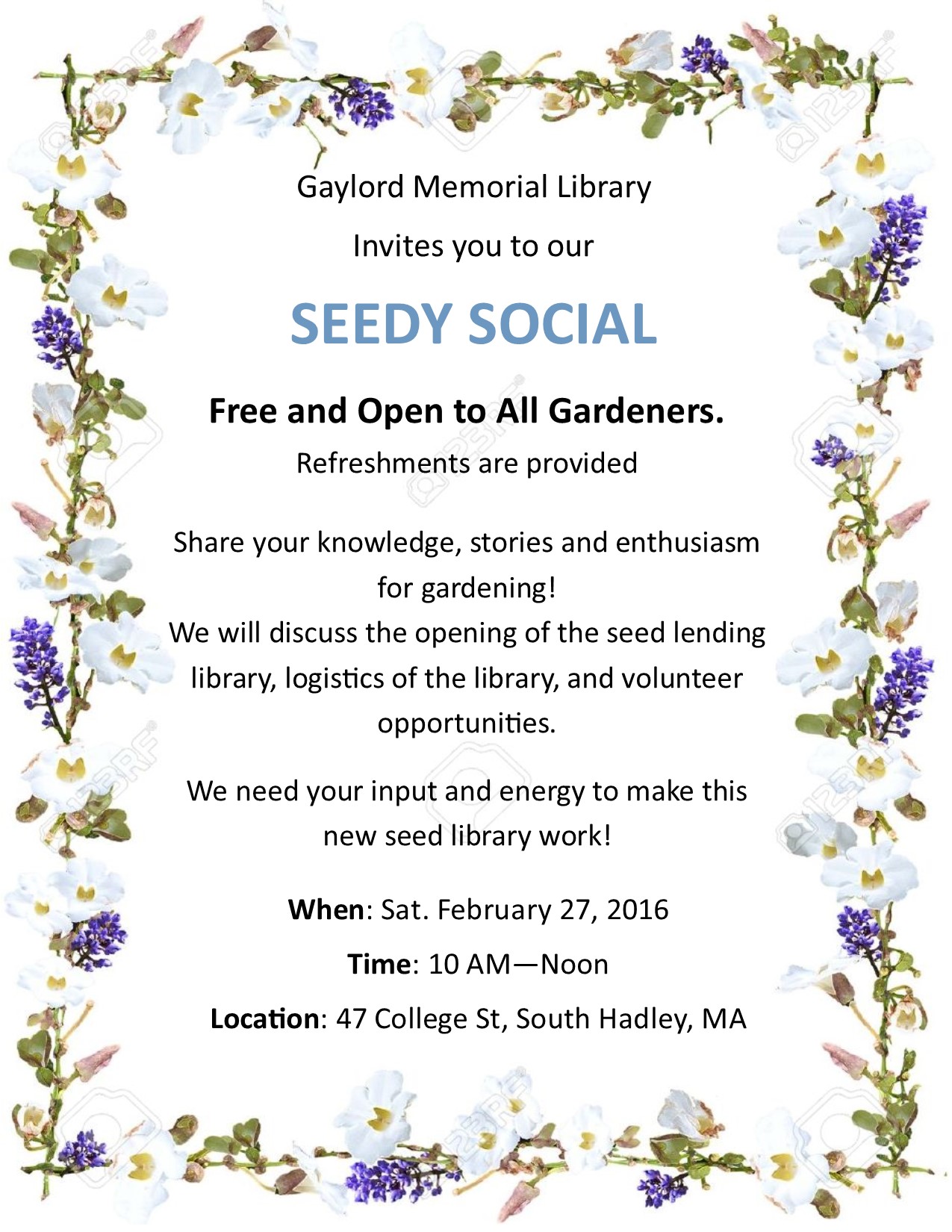 seedy event Published January 23, 2016 at 1275 × 1650 in Gaylord Memorial Library ← Previous Next → Seedy Social Like Loading...