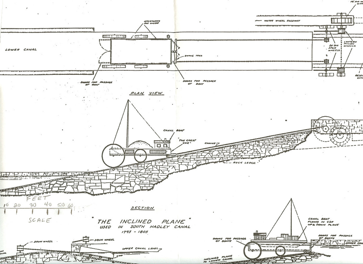 According to Alice Morehouse Walker, whose knowledge of Hadley truly is amazing, the inclined plane canal began construction in 1792 (1906: 109). The impetus for such an endeavor was a company, “The Proprietors of the Locks and Canals on the Connecticut River.” At the time, the Connecticut River facilitated transportation considerably (more articles to follow regarding the River). As Walker writes, “this natural waterway formed a connecting link between the isolated villages by means of which they were kept in touch with each other and in communication with the outside world” (1906: 109). Lumber was rafted down river, in addition to “farm produce, shingles, ash plank, furs and fish” (Walker, 1906: 107). Once downstream, the rafts and boats had to be poled up stream. “Poling was the hardest work known and caused much lameness and blistering of the skin in front of the shoulder, for which a frequent application of rum was a remedy” (Walker, 1906: 108). Furthermore, in South Hadley, “The Connecticut River had a fall of about fifty-three feet in the two and one half miles of rapids” (Taugher, 5). An inclined plane canal, in this context, is justifiable.